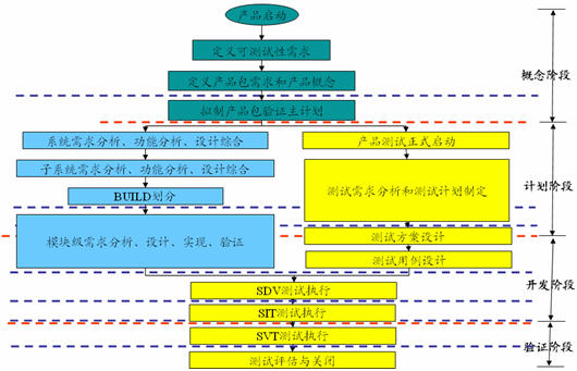 在新产品开发过程中,测试人员从概念阶段一开始要参与到整个研发活动中,越早进入越好,每个过程需要都要应该有任务,而不是到系统开发完毕转测试时才正式进行测试,每个阶段的活动如下: