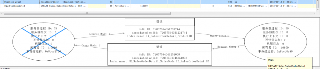 在SQLServer Profiler中,演示了如何收集死锁事件,在跟踪结果中可以看到两个事务尝试在一个拥有共享锁的键上添加排它锁。通过死锁图像,可以看到死锁发生的细节。