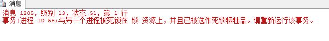 在配置好之后,运行跟踪,并在ssms中运行脚本。SQLServer会自动处理和侦测这种类型的死锁。然后会在第二个窗体中收到1205的错误。