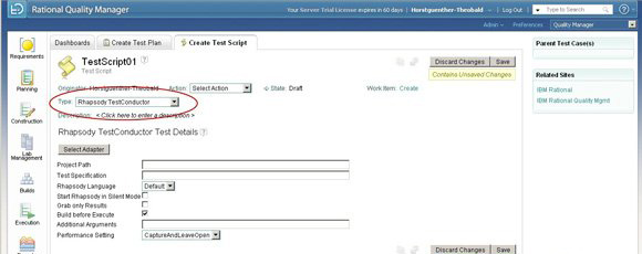 对于 Rational Quality Manager 与 Rhapsody TestConductor Add On,您可以使用特定的适配器,来访问直接来自于 Rational Quality Manager 的基于模型的测试。在适配器启动之后,它可以自动连接至 Rational Quality Manager。