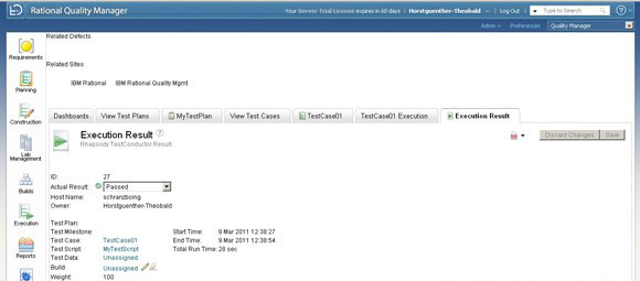 在 Rational Quality Manager 中执行测试脚本之后,所有的测试结果,例如状态(通过或失败),以及日志文件,会在 Rational Quality Manager 中得到直接的访问(见于图 9)。这意味着您可以使用 Rational Quality Manager 所有的报告功能,来访问项目的质量状态,甚至在开发的早期阶段也是如此。