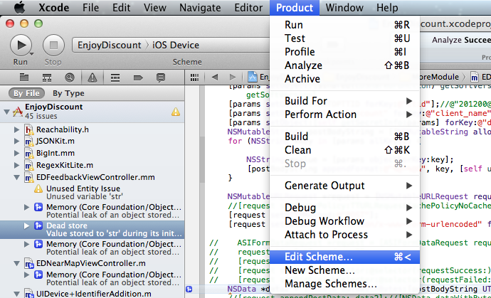 关于代码静态检查好是针对iphoneos(好不要采用iOSSimulator)的Release版本进行静态扫描;在Xcode中可以通过Product->Edit Scheme来进行设置: