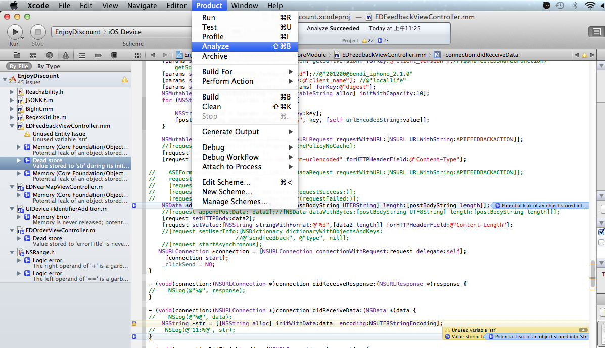 Xcode中集成了Clang Static Analyze检查器,通过该检查器可以对工程进行静态分析,通过分析可以找出代码中存在的潜在问题,如潜在的内存泄露、变量未赋值使用、变量定义之后没有使用或者除零等逻辑错误;