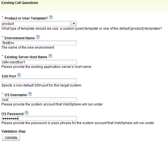 第六步:这里首先给出一个 Virtual System Pattern(VSP) 的名称,这个名称相当于我们正常理解的 VM template,然后需要用户提供测试环境的信息,hostname,用户名和密码,后一个选项是提示用户是否覆盖已经存在的同名的 VSP