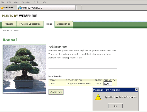 我们以 WAS 中的 Plants by WebShere 程序为例,假定购买 Bonsai Tree 时,在 QUANTITY 框输入 abc,弹出告警消息框 Quantity must be a valid number。现在假定 Plants by WebShere 程序设计已经更改,弹出告警消息框中的内容应该为 Warning:Quantity must be a valid number。所以测试人员发现了一个缺陷,现在录制这个缺陷的重现步骤。