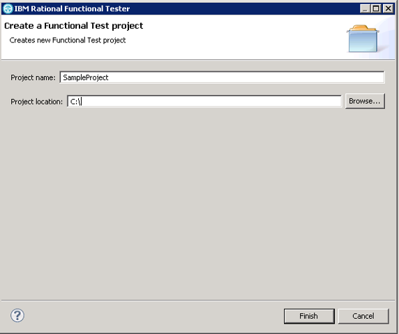 在创建项目界面中输入项目名称和项目路径。点击 Finish 按钮,会创建好一个 RFT 项目。