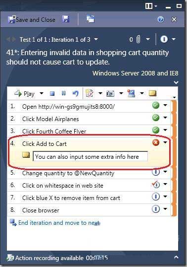 而如果我们发现被测软件出现异常,我们应首先将当前步骤标示为“未通过”,即打一个红色的叉,同时,我们还可以在当前步骤的正下方输入一段文字来说明我们目击到的情况(参考图3)。