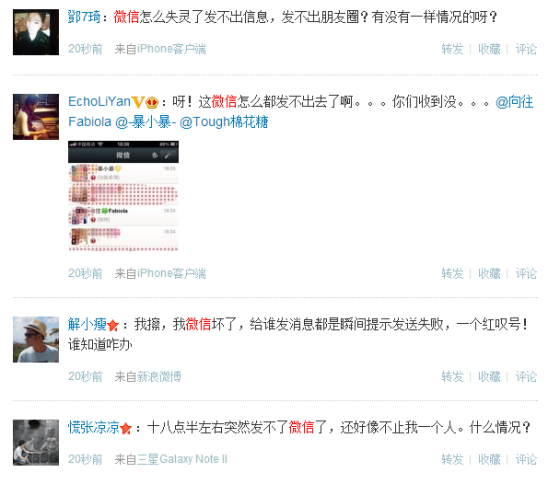 不过,据多位新浪微博网友反映,无论移动、联通、电信网络还是WiFi情况下,微信使用均出现了网络故障,不仅无法发送消息,也无法使用朋友圈等各项功能。
