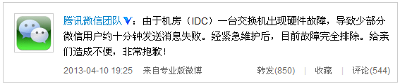 据腾讯微信团队官方微博消息,由于机房(IDC)一台交换机出现硬件故障,导致少部分微信用户约十分钟发送消息失败。经紧急维护后,目前故障完全排除。给亲们造成不便,非常抱歉!