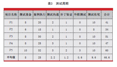 (3)测试周期。尽管版本下的项目都在版本测试周期内展开,但因为测试内容、环境准备、项目沟通、补丁交付等各种原因,各个项目的测试周期也不尽相同。各项目测试并行执行,平均有效测试周期为46.6天(如表3所示)。