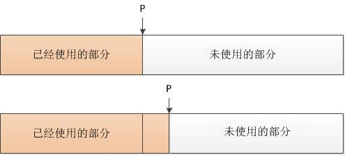 软件开始运行时,运行时会为每一个Generation预留一块连续的内存(这样说并不严格,但不影响此问题的描述),同时会保持一个指向此内存区域中尚未使用部分的指针P,当需要为对象分配空间时,直接返回P所在的地址,并将P做相应的调整即可,如下图所示。【顺便说一句,也正是因为这一技术,在.NET中创建一个对象要比在C或C++的堆中创建对象要快很多——当然,是在后者不使用额外的内存管理模块的情况下。】