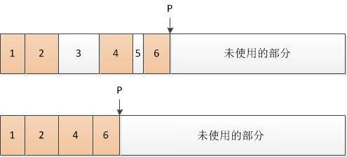 在对某个Generation进行垃圾回收时,运行时会先标记所有可以从有效引用到达的对象,然后压缩内存空间,将有效对象集中到一起,而合并已回收的对象占用的空间,如下图所示。
