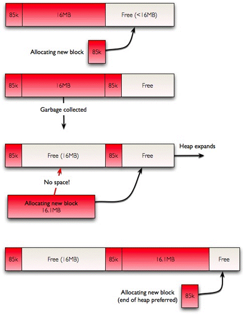 但是,问题出在上面特别标出的“一般情况”之外。.NET会将对象分成两种情况区别对象,一种是大小小于85, 000字节的对象,称之为小对象,它对应于前面描述的一般情况;另外一种是大小在85, 000之上的对象,称之为大对象,是它造成了前面示例代码中内存使用率的问题。在.NET中,所有大对象都是分配在另外一个特别的连续内存(LOH, Large Object Heap)中的,而且,每个大对象在创建时即属于G2,也是说只有在进行Generation 2的垃圾回收时,才会处理LOH。而且在对LOH进行垃圾回收时不会压缩内存!更进一步,LOH上空间的使用方式也很特殊——当分配一个大对象时,运行时会优先尝试在LOH的尾部进行分配,如果尾部空间不足,会尝试向操作系统请求更多的内存空间,只有在这一步也失败时,才会重新搜索之前无效对象留下的内存空隙。如下图所示: