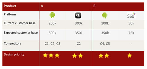 对“功效”一词的理解可以上升到整个产品研发周期及市场的层面上。很多时候,公司会希望快速上线一款新产品,或是开发一个产品系列(例如基于一个平台的多款同类产品,或面向不同平台的单一产品),亦或是出于时间和资源的限制,必须从多个产品中选择一款来优先完成。在这类情况下,设计与优化的工作力量必须集中在那些重要的产品上。优先级矩阵可以有效的帮助我们理清头绪。