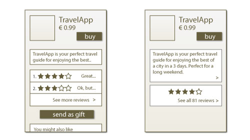 下图展示了一款购物应用的商品详情页面的两种设计方案。左边的原型中包含了一些“高级”购物功能,例如赠礼、相关商品和用户评价;而右侧的原型简化了很多:去掉了赠礼功能;只显示该商品的整体打分情况,如果用户需要,可以点击链接查看全部点评;省出的空间用以显示商品介绍的全文,用户无需进一步点击可以完整浏览。