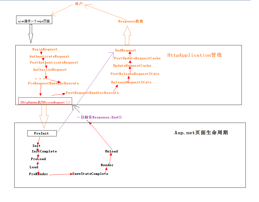 上图是自己画的一个缩减版IIS接收到一个aspx请求的HttpApplication管线和asp.net Page在执行ProcessRequest()方法中的页面生命周期的部分事件。Page本身是继承自IHttpHandler接口,IHttpHandler提供了一个重要的约束方法ProcessRequest,该方法是对接收到的信息(HttpContext)进行具体的处理同样,一般处理程序和web服务也实现了自己的IHttpHandler,并以此提供一些Ajax服务。具体的操作过程请自行查找MSDN。