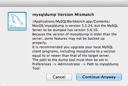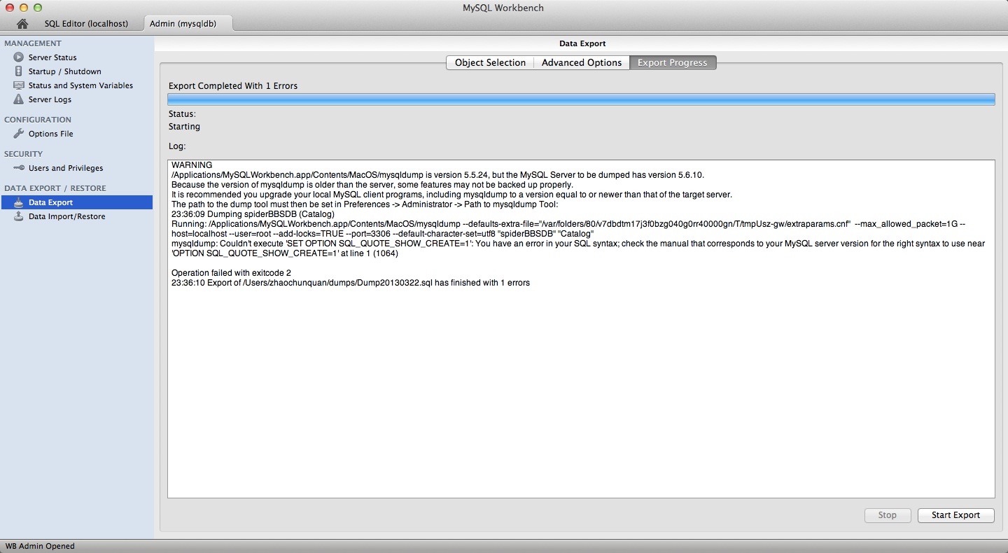 我想把本机数据库内的数据迁移到另一台机器上,于是使用Workbench中自带的import/export功能,其实是调用mysqldump。不幸的是,出现了版本不一致的错误。