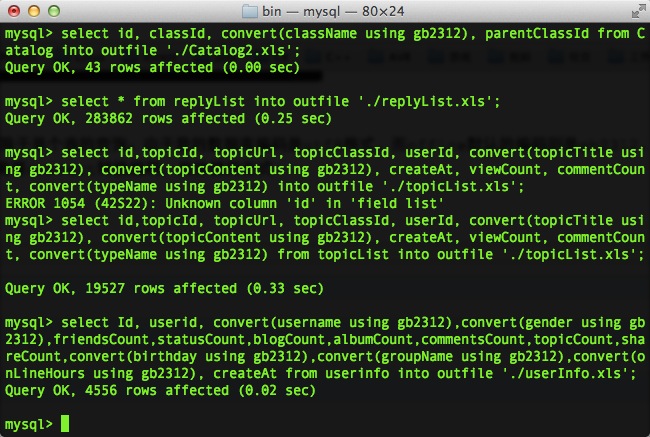4、使用sql语句导出需要的数据,sql语句不限于单个表的查询。由于我的数据库编码是utf8格式,而office默认的编码则是gb2312,所以当某个字段中包含中文时,导出到excel后,中文内容是会乱码的,此时需要convert转换编码,具体使用方式: