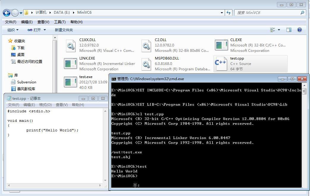 那么我们来测试下,不用IDE,仅用纯命令编译个C++小程序。我们使用VC6.0的编译器:CL.exe