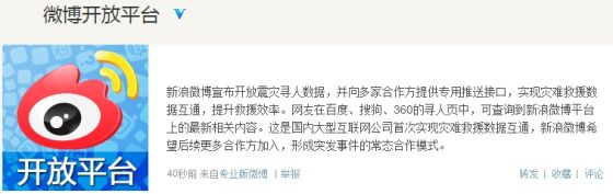 4月22日早上8点30分,新浪微博宣布开放震灾寻人数据,与百度、搜狗、360等合作方实现打通,以此提升救灾工作的效率。此次合作,是国内大型互联网公司首次在灾难救援方面实现数据互通,将为今后的救援项目积累丰富的经验。目前,新浪微博还在主动联系其他平台,希望能汇聚更多的力量,共同推进线上救援。