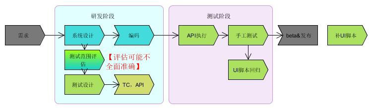 ● 【时代特征】尝到自动化的甜头后,测试团队全员都开始投入自动化工作,UI和API全面开花。 建立自动化持续集成, 自动化成为发布前标准等。