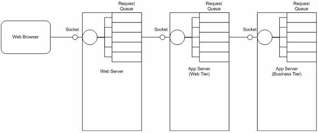 一个请求穿过一个物理层,比如在web层和业务层之间切换,或者调用外部服务器,比如web服务,每当这种时候,都意味着伴随着转换,这里存在一个隐式等待点。如果服务器在某一时刻只处理单个请求是没有效率的,因此他们使用了多线程方法。典型的,一个服务器在某个socket端口监听访问的请求——每当收到一个请求它会把请求放在队列中,然后返回监听其他请求。请求队列对应着一个线程池,负责从队列中提取请求并处理。图2描述了对于三层结构(web服务器、动态web层和业务层)的执行过程。