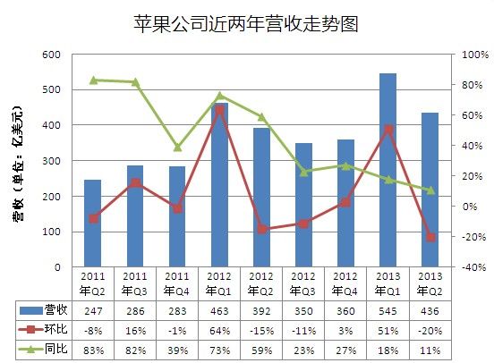 北京时间4月24日凌晨消息,苹果公司发布了2013财年第二财季财报。报告显示,苹果公司第二财季营收为436.03亿美元,比去年同期的391.86亿美元增长11%;苹果公司第二财季净利润为95.47亿美元,比去年同期的116.22亿美元下滑18%。来自大中华区的营收为82.13亿美元,比去年同期的76.37亿美元增长8%,增幅仅略高于美洲部门。