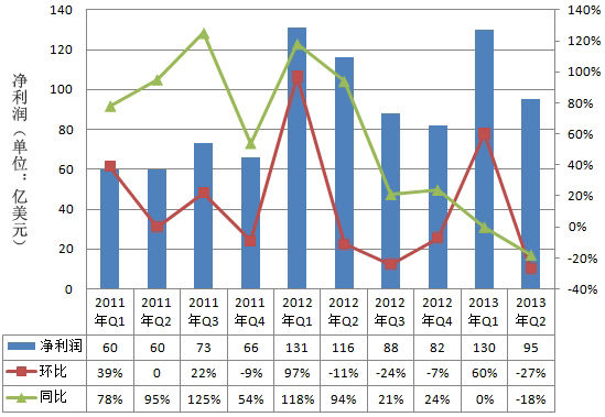 在截至2013年3月30日的这一财季,苹果公司的净利润为95.47亿美元,每股摊薄收益10.09美元,这一业绩不及去年同期。2012财年第二财季,苹果公司的净利润为116.22亿美元,每股摊薄收益12.30美元。苹果公司第二财季运营利润为125.58亿美元,低于去年同期的153.84亿美元。苹果公司第二财季营收为436.03亿美元,比去年同期的391.86亿美元增长11%,其中国际销售额所占比例为66%。苹果公司第二财季毛利率为37.5%,远低于去年同期的47.4%。