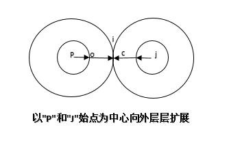 第2方法是:针对第1种方法的改进,是采用多源点方法,这里是以节点"p"和节点"j"为中心向外层扩展,直到两圆外切点,如图4: