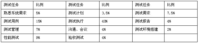 ● 后,根据对几个项目的工作量、成本以及测试任务占项目总测试投入的比例分析后,得到测试团队测试工作量估算的简易公式。可以根据这个简易的公式进行测试的估算,方便测试计划中关于工作量估算部分的编写,避免在估算工作量时缺乏依据。估算内容主要包括:测试总人力成本占项目总人力成本的比例及各项测试任务的工作量分配比例。