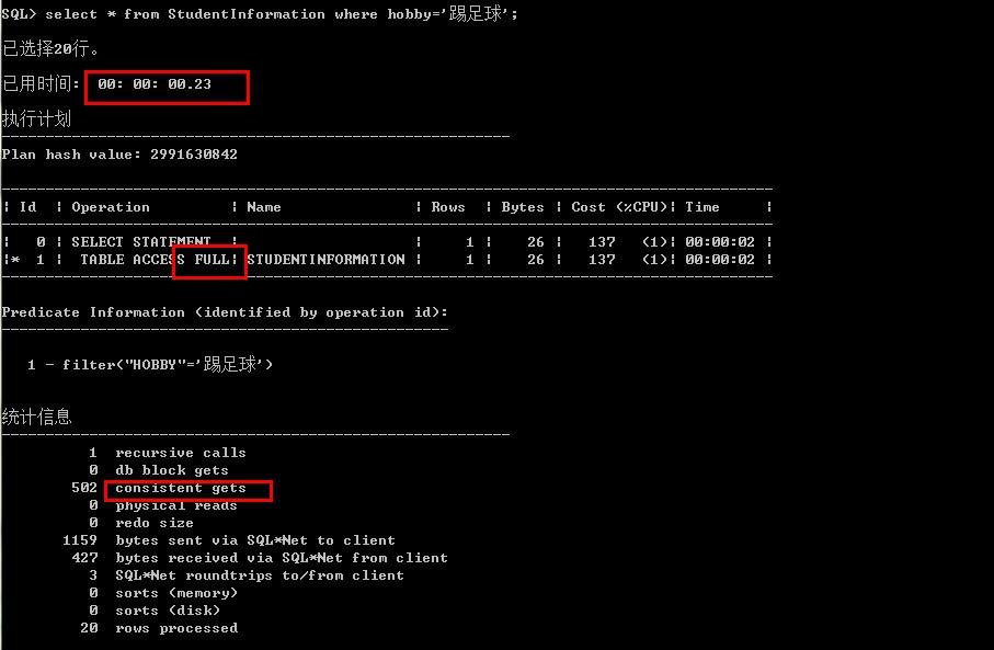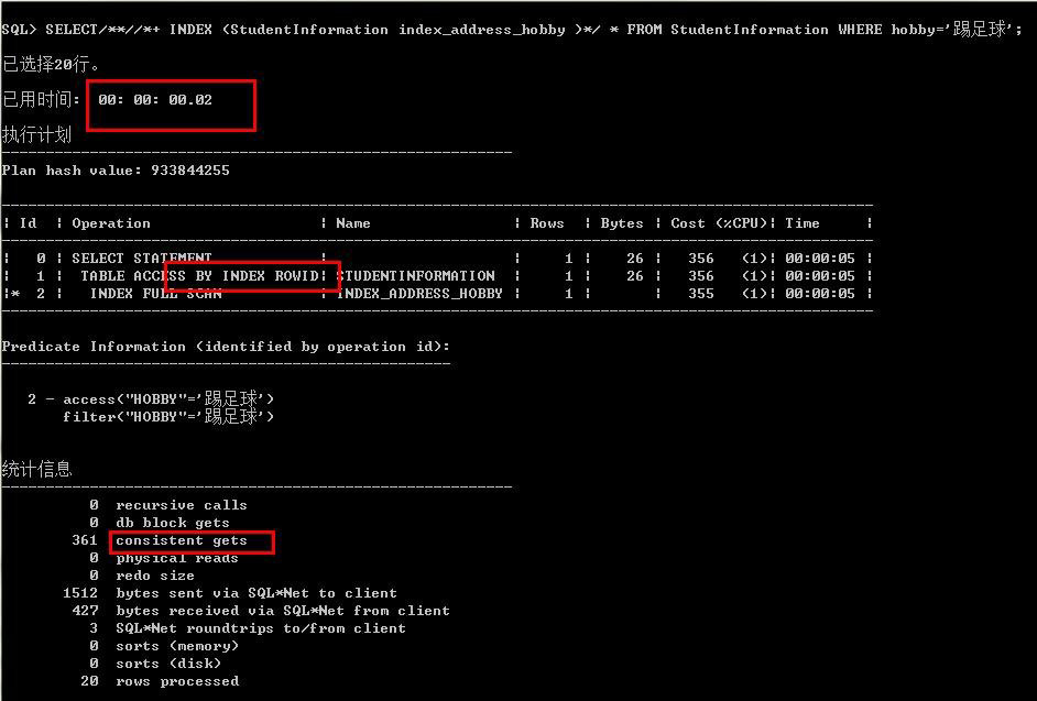 SQL> SELECT/**//*+ INDEX (StudentInformation index_address_hobby )*/ * FROM StudentInformation WHERE hobby='踢足球';