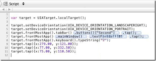 5)现在,你可以操作你的应用程序;你将看到录制的交互操作出现在脚本窗口(甚至旋转事件)。点击方形按钮来停止录制。