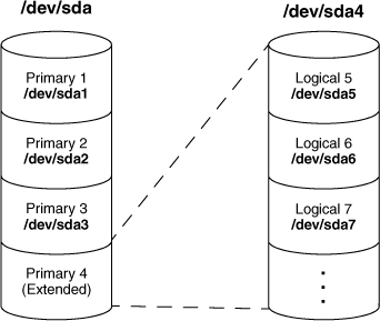 在前面的例子中,分区 4 定义了一个扩展分区,其中包含 165GB 磁盘中的 143 GB(如图 1)。使用时不能更改逻辑分区,否则会影响其中的所有逻辑分区。