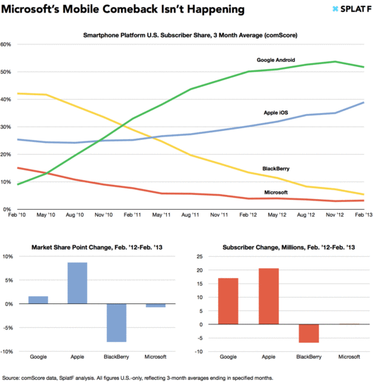 北京时间4月7日消息,根据美国市场研究公司comScore新发布的报告,微软Windows Phone手机的市场份额近一年来几乎为零增长,表明微软的移动复苏战略未见成效。