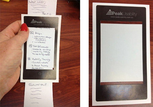 将一张包含若干屏界面元素的纸质原型一股脑展示给用户的话,很难达到良好的测试效果。可以试着用硬纸板制作一个手机模板,如下图所示,在屏幕上下两端各开一道缝隙,将长界面原型插入到模板当中。这样可以模拟用户在实际设备上所看到的可视区域了。