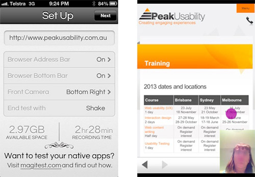 据我所知,有两款iOS应用可以比较好的解决其中的一部分问题。一个是UX Recorder,这款应用不仅可以记录屏幕上的各种行为,而且可以捕捉用户的手势(圆圈表示点击,箭头表示滑动扫屏等),同时还能通过前置摄像头及麦克风记录用户的表情和语音。不过大的问题在于,这个软件只能用来在浏览器中对移动网站进行测试,不能用在原生应用上。