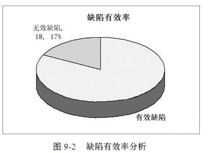 如图9-2所示,测试过程共发现103个缺陷,其中有效缺陷85个,占总缺陷的83%,无效缺陷18个,占总缺陷的17%。一般来讲,有效缺陷在80%以上算是比较良好的。