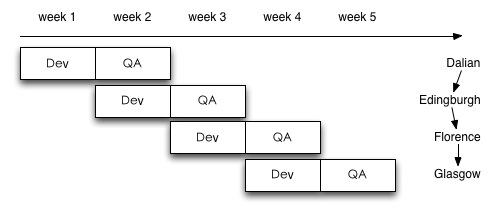 开发人员可以同时工作在好几个版本下。在途客圈,一个relase(或者一个scrum)以两周为周期,一周开发,一周测试,然后上线,如图所示: