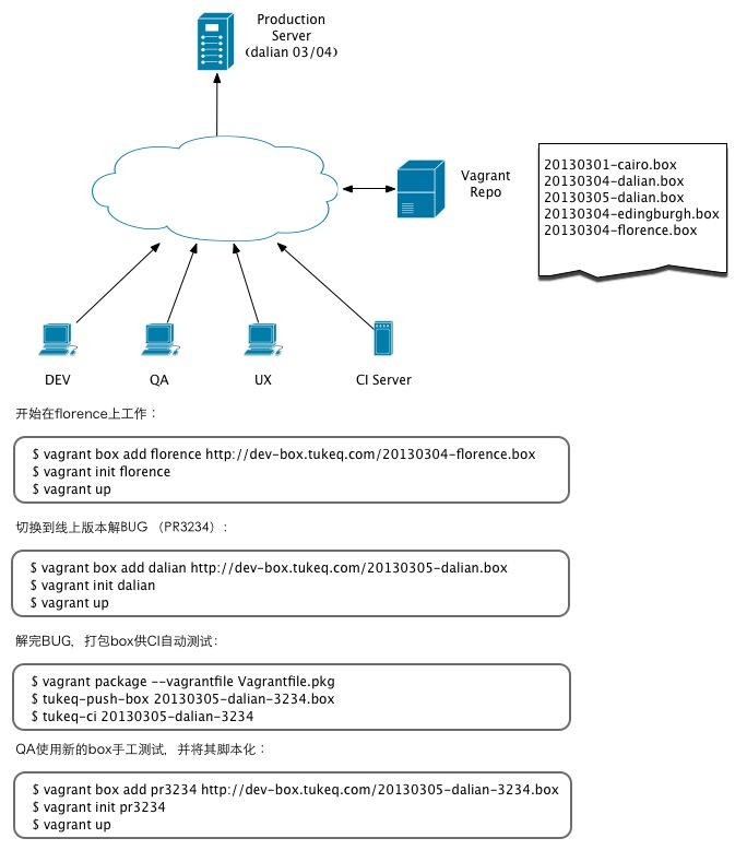在这个模型中,大家交流的基础是虚拟机。虚拟机随时被创建,随时又销毁,有一个box服务器 vagrant repo 来统一存储所有box并提供上传/下载服务。box服务器提供两类box: