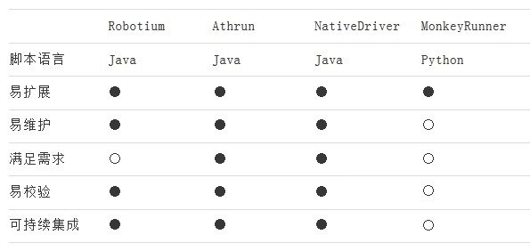 为了方便编写自动化测试用例,我们需要对ActivityInstrumentationTestCase2进行扩展。业界也已经有一些成熟的自动化工具,诸如Robotium、Athrun、NativeDriver、MonkeyRunner等。我们需要针对自身产品的需求,从中选取一款合适的工具来实现自动化。对于移动客户端GUI的自动化而言,需要保证选取的工具有以下几点特性: