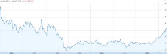 下图显示的是从2006年至2013年5月17日的雅虎股价。在“后杨致远”时代,投资者似乎都对雅虎的方向没有信心,从而对股价形成了重大影响。但该股近期却一路上扬,上周五报收于26.52美元。