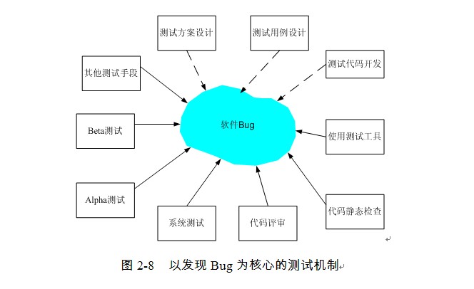 总之,测试是为了发现Bug,测试所做的工作无一不是围绕Bug而展开,如图2-8所示。测试发现Bug越多,测试人员越自豪,越有成感,这个观点已几乎根深蒂固地扎在了我们的心里,测试除了发现Bug真没其他事情可做吗?