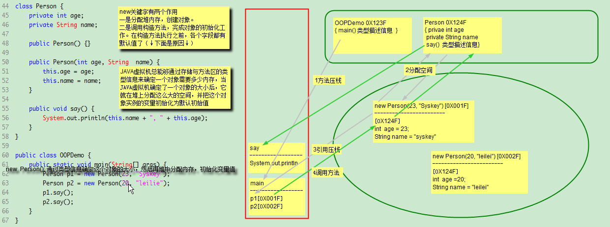 ok,现在通过存储在方法区中Person类的类型信息确定了实例对象需要分配的空间大小,在堆中分配空间,并把实例对象的变量初始化为默认值。比如int初始化为0,引用变量初始为null。此时,对象创建完成。new操作的第一步执行完毕。new操作的第二步开始执行,调用构造方法,完成对象的初始化工作。然后把对象在堆空间的地址赋值给引用类型变量p1。整条Person p1 = new Person(23, "Syskey");指令执行完成。图中箭头2分配空间跟箭头3引用压栈。(此处省略第二条创建对象语句)。