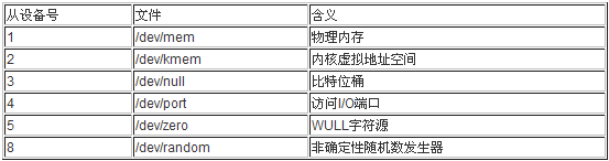 来看内核中一个简单的字符设备驱动的例子,其主设备号为1,根据LANANA标准,该设备有10个不同的次设备号。每个都提供了一个不同的功能,这些都与内存访问操作有关。下面列出一些次设备号,以及相关的文件名和含义。