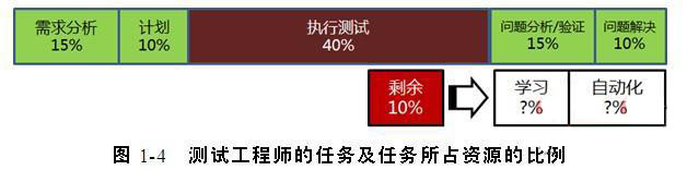 从图1-4中可以发现,对于一个普通的测试工程师来说,执行测试消耗了很大一部分时间,而常规项目 的任务把可用时间的90%都占用了,剩余可以用于提高生产效率的资源变得非常紧缺。而提高生产效率从长远来说又能降低常规项目任务占用时间的比例。
