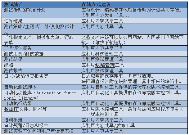 存储过程是一个由一系列规则和惯例组成的框架,它通常是由一个团队制定的,并规定了重要的资产应如何存储以及在哪里存储。下表提供了不同测试资产的恰当的存储方式。这些方式都是从业界的佳实践中收集来的。尽管这些方式有助于测试团队建立可靠的测试资产存储过程,然而建立佳存储过程并不像表中所讲的那么简单。佳存储过程并没有统一通用的模式。很多具体细节都决定了一个团队对佳的定义,如:团队资产所需的存储容量,一定时间段内资产容量的预期增长情况,资产存储所需的工具和使用许可,组织目标和约束等。