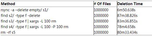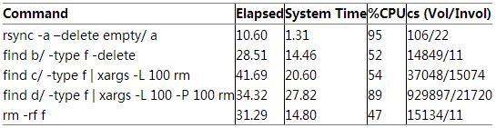 他没有使用find 或 xargs,他很有创意的利用了rsync的强大功能,使用rsync –delete将目标文件夹以一个空文件夹来替换。之后,我做了一个实验来比较各种方法。让我吃惊的是,Lee的方法要比其它的快的多。下面是我的测评。