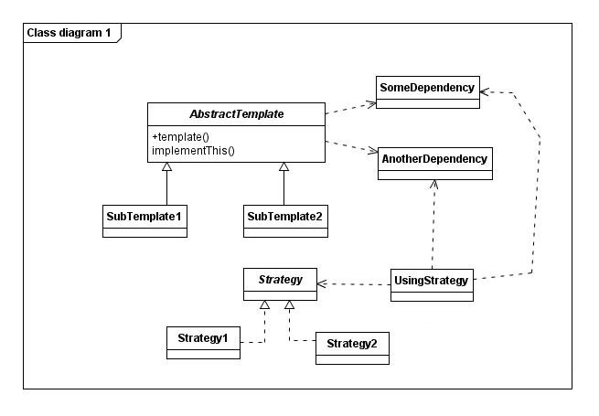 先来看一下template版本的测试方案,我们需要分别对SubTemplate1和SubTemplate2的template()编写测试,并且由于AbstractTemplate的template()依赖SomeDependency和AnotherDependency,所以在以上两个测试中,我们需要使用Stub/Mock将它们替换掉,并为每一个测试准备一整套测试数据,即使它们的implementThis()方法只是return 1 和return 2。