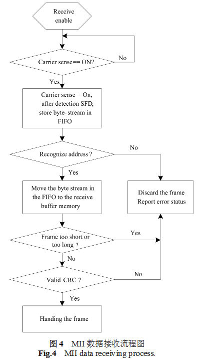 通过MII 接口接收一个完整的数据帧,包含以下五个部分:帧间隔、前导段、帧起始符SFD、数据以及帧结束符。其中帧起始符的比特序列为10101011,可以通过寻找“0x5D”这个关键字来判断帧的起始,主要流程如图4。