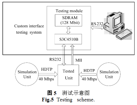 按照上述测试方法,我们设定两端仿真节点以不同的数据率产生测试数据帧,对待测节点进行了多次接口测试实验。测试结果表明,在两边仿真节点以40 Mbps 速率发送测试数据帧的情况下,测试模块仍能够正确接收这80 Mbps 的数据;测试模块通过RS232 向PC 机转发数据,在9600、19200 和38400 波特率(仿真节点发送数据率低于转发速度)下,连续40 h 测试均正确上传数据。由测试模块加PC机共同构成的简便测试系统可以用较低成本较好地满足专用接口测试的需要。